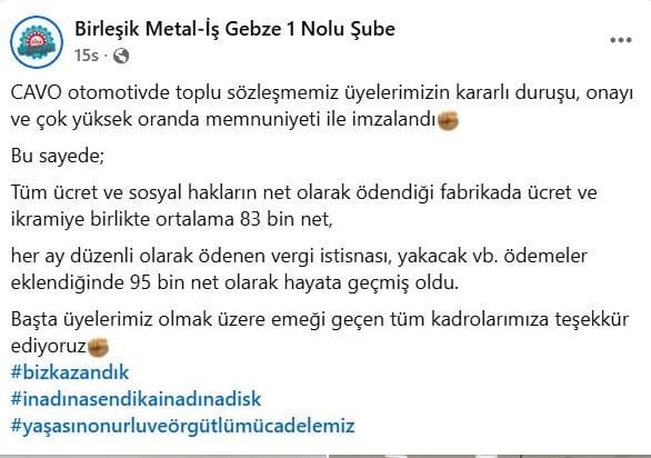 “CAVO otomotivde toplu sözleşmemiz üyelerimizin kararlı duruşu, onayı ve çok yüksek oranda memnuniyeti ile imzalandı. Bu sayede; Tüm ücret ve sosyal hakların net olarak ödendiği fabrikada ücret ve ikramiye birlikte ortalama 83 bin net, her ay düzenli olarak ödenen vergi istisnası, yakacak vb. ödemeler eklendiğinde 95 bin net olarak hayata geçmiş oldu. Başta üyelerimiz olmak üzere emeği geçen tüm kadrolarımıza teşekkür ediyoruz.”