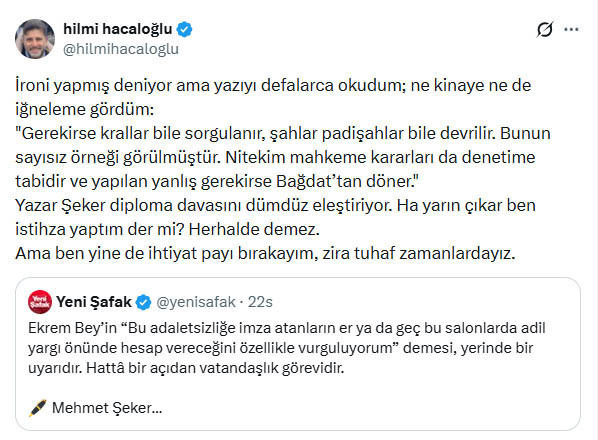 Yeni Şafak yazarı Mehmet Şeker, tutuklu İBB Başkanı Ekrem İmamoğlu’nun diploma davasında ortada suç olmadığını savunarak hakimin beraat vermesi gerektiğini yazdı. Odatv’nin gündeme taşıdı yazı ardından Gazeteci Hilmi Hacaloğlu dikkat çeken bir paylaşımda bulundu.