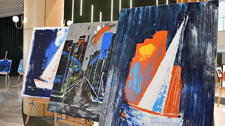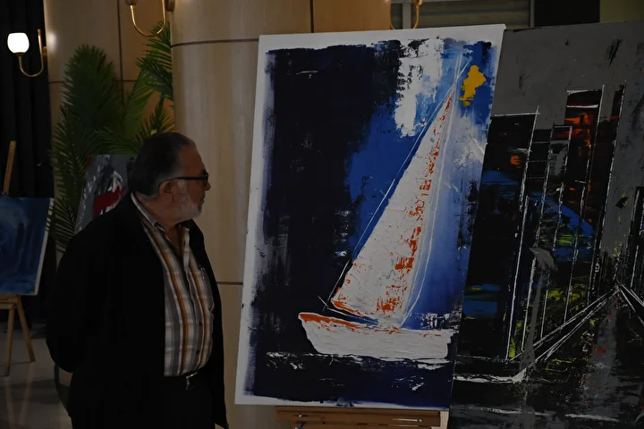 Ressam Öztürk, eserlerinin yer aldığı her bir şövalenin üst kısımlarına mavi kurdele bağlayarak, Gazze Şeridi’ne insani yardım götürmek için yelken açan Küresel Sumud Filosu’na destek mesajı gönderdi.